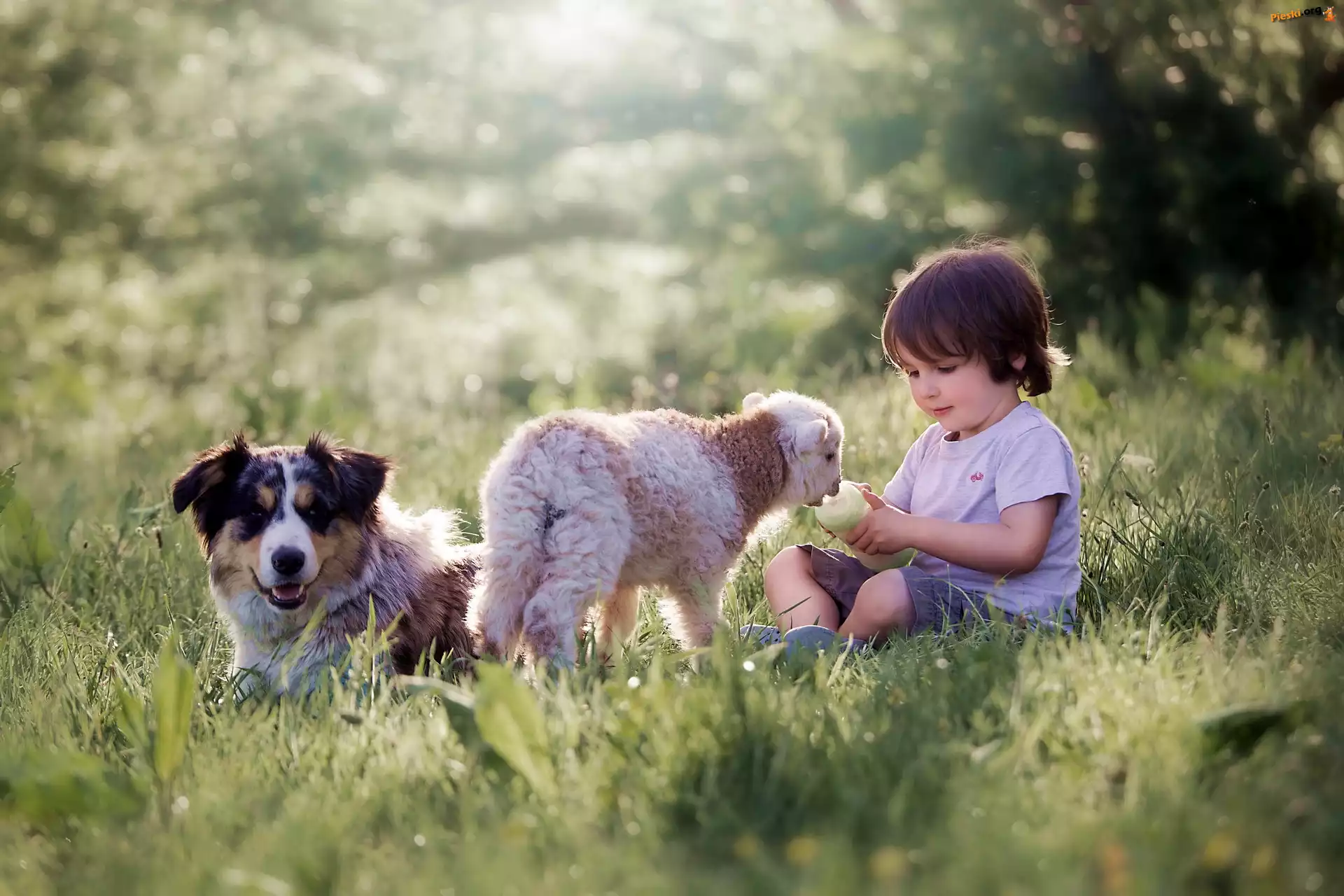Dziecko, Łąka, Owieczka, Pies, Owczarek australijski, Trawa, Pieski