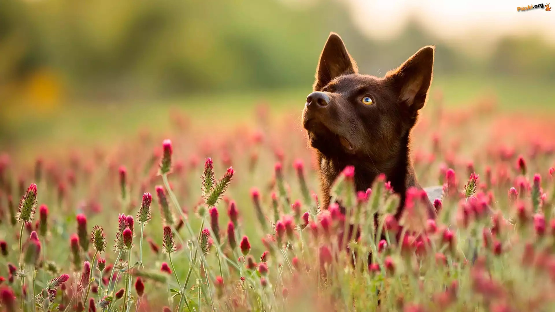 Łąka, Mordka, Pies, Owczarek australijski kelpie, Kwiaty fale, piasek, Owczarek australijski - Kelpie Brązowy, Owczarek australijski - Kelpie Owczarek australijski Kelpie, Mordka Owczarek australijski - Kelpie, Szczeniak Cztery, Owczarki australijskie - Kelpie