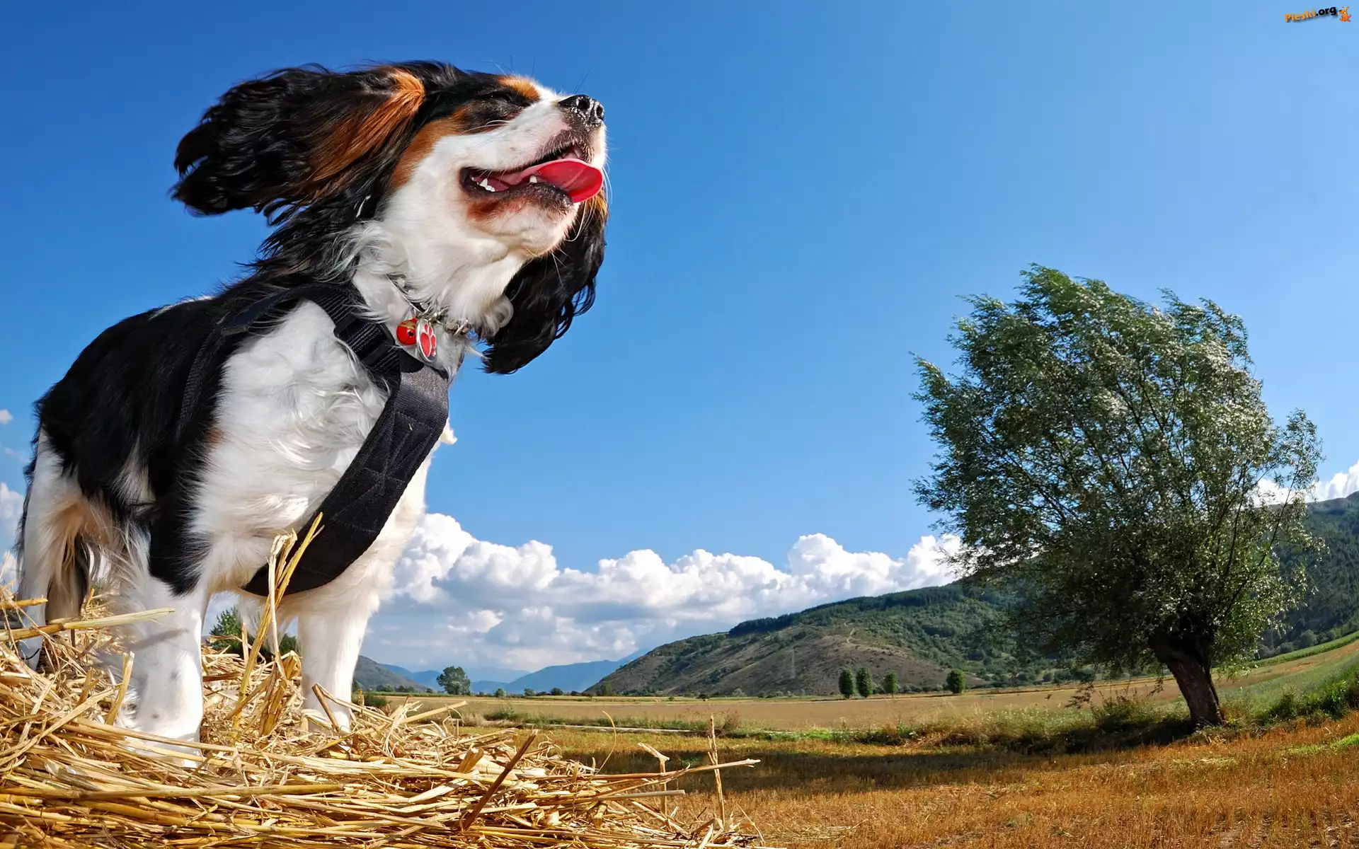 Łąki, Drzewo, Chmury, Pola, Niebo, Pies, Pieski