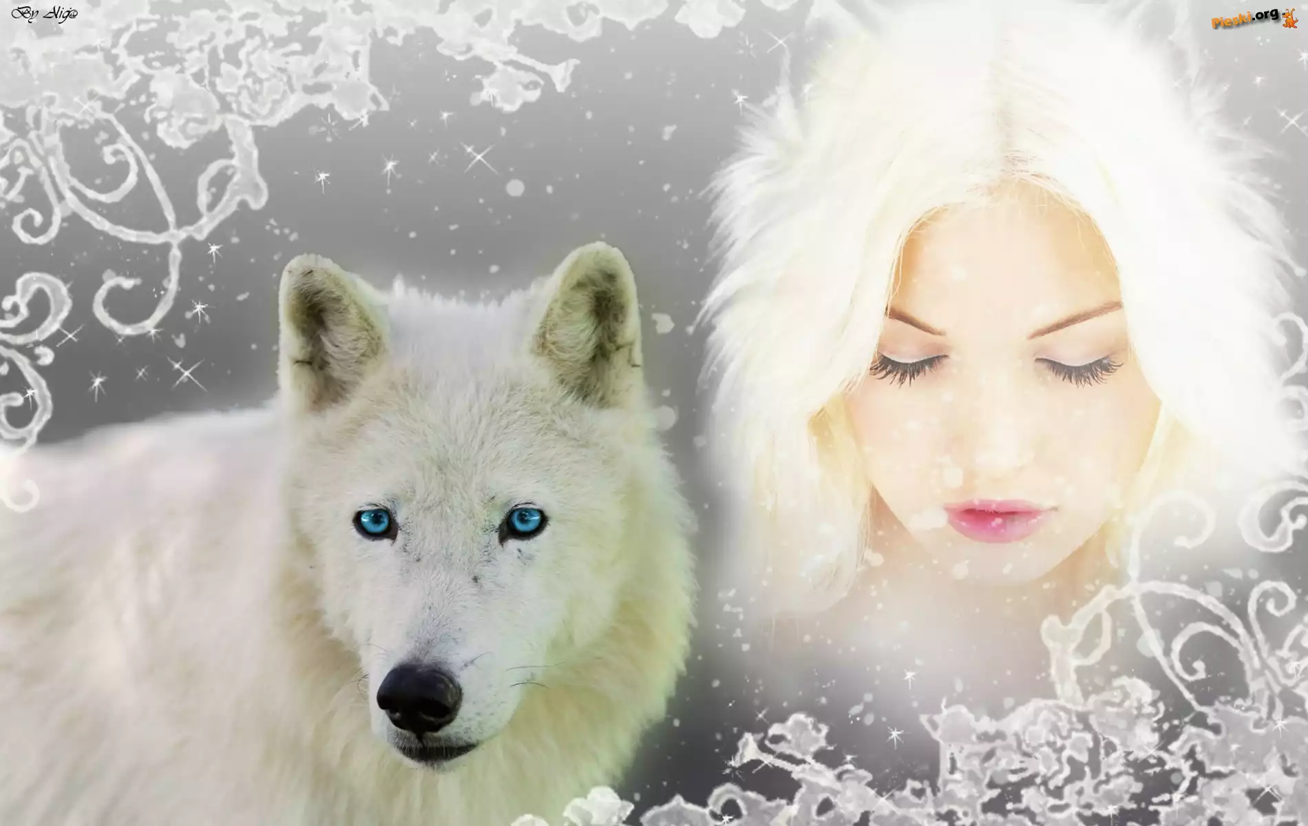 Biały, Siberian Husky, Kobieta, Pieski