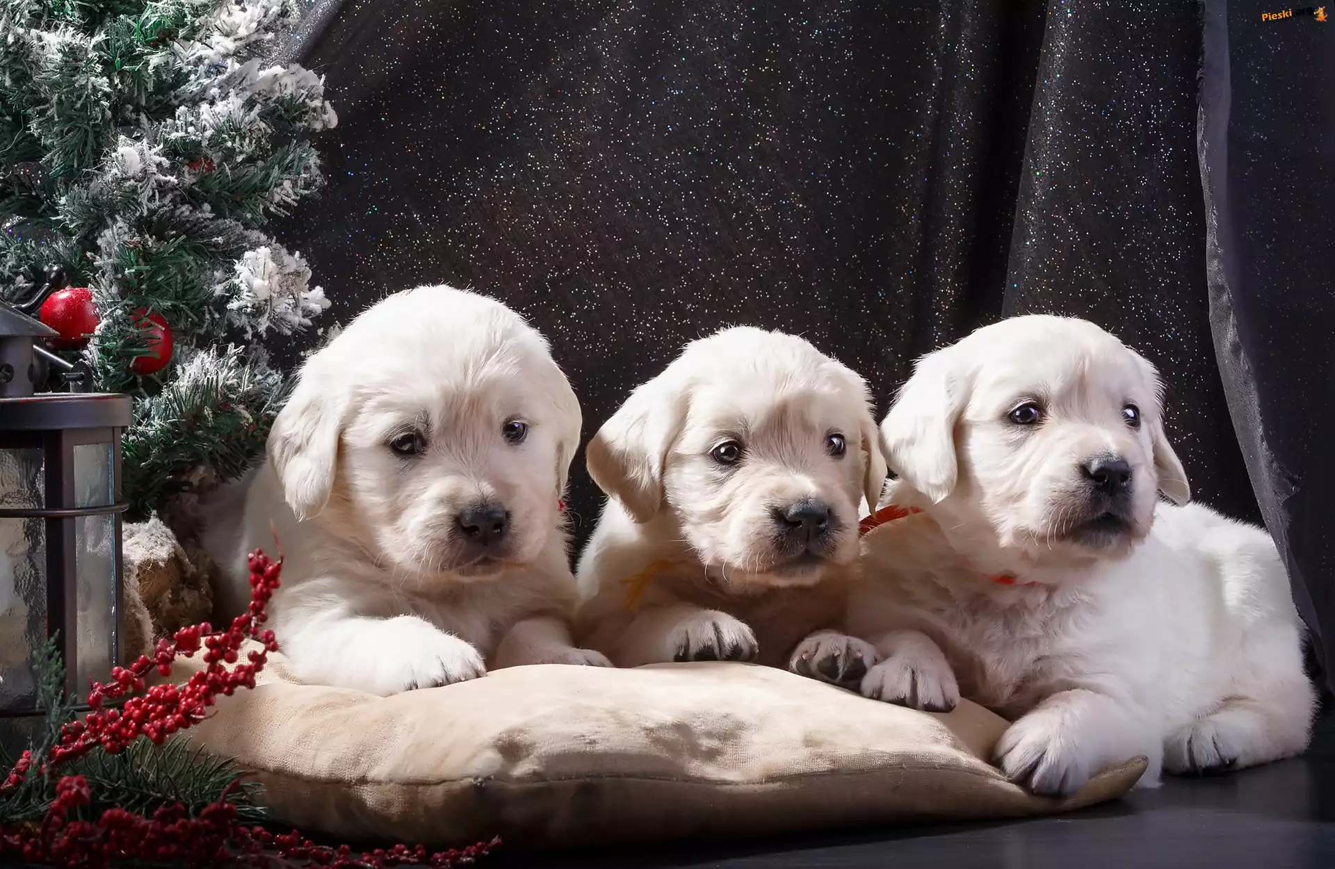 Choinka, Szczeniaki, Trzy, Golden retriever, Poduszka, Pieski