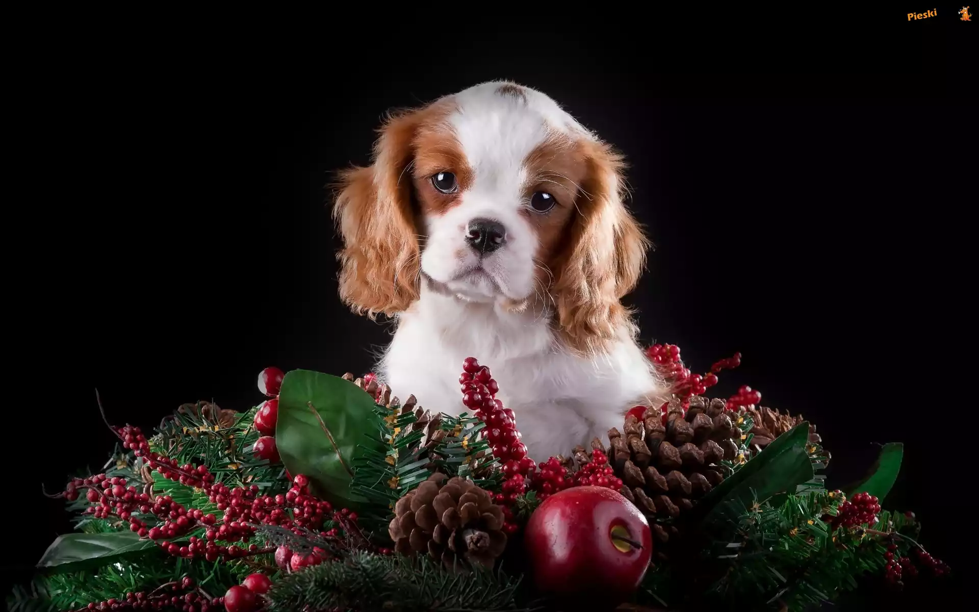 Świąteczna, Szczeniaczek, Słodki, Cavalier King Charles spaniel, Dekoracja, Pieski