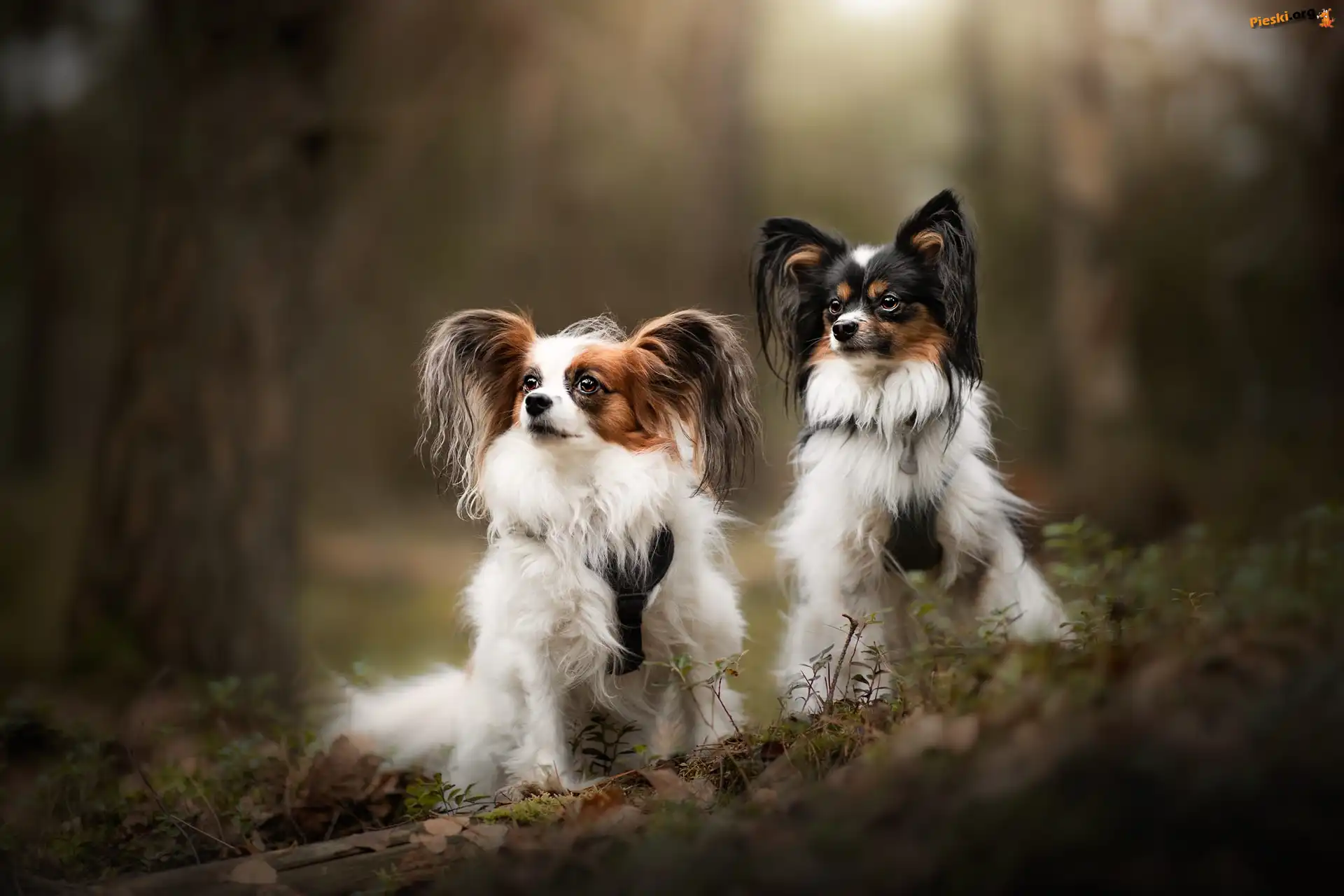 Dwa, Spaniele kontynentalne miniaturowe Papillon, Las, Psy, Drzewa, Pieski