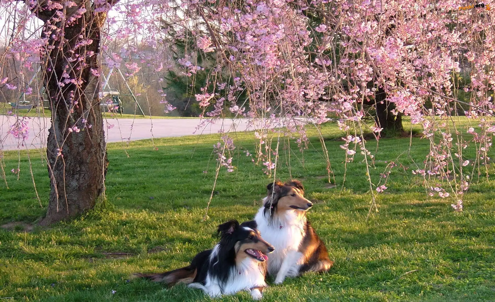 Drzewa, Łąka, Owczarki, Kwitnące, Wiosna, Pieski