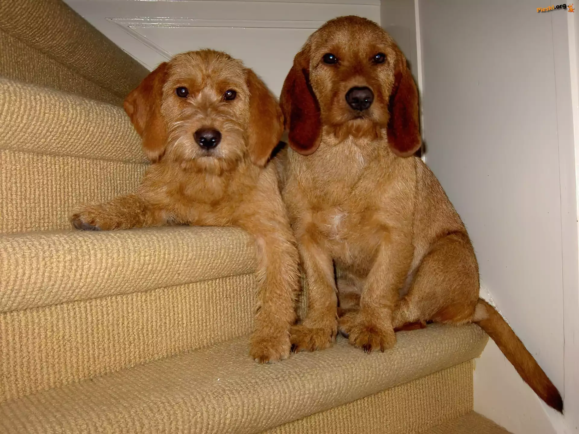 Basset Fauve de Bretagne skulony, Basset Fauve de Bretagne Basset Fauve de Bretagne, dwa, słodkie, schody