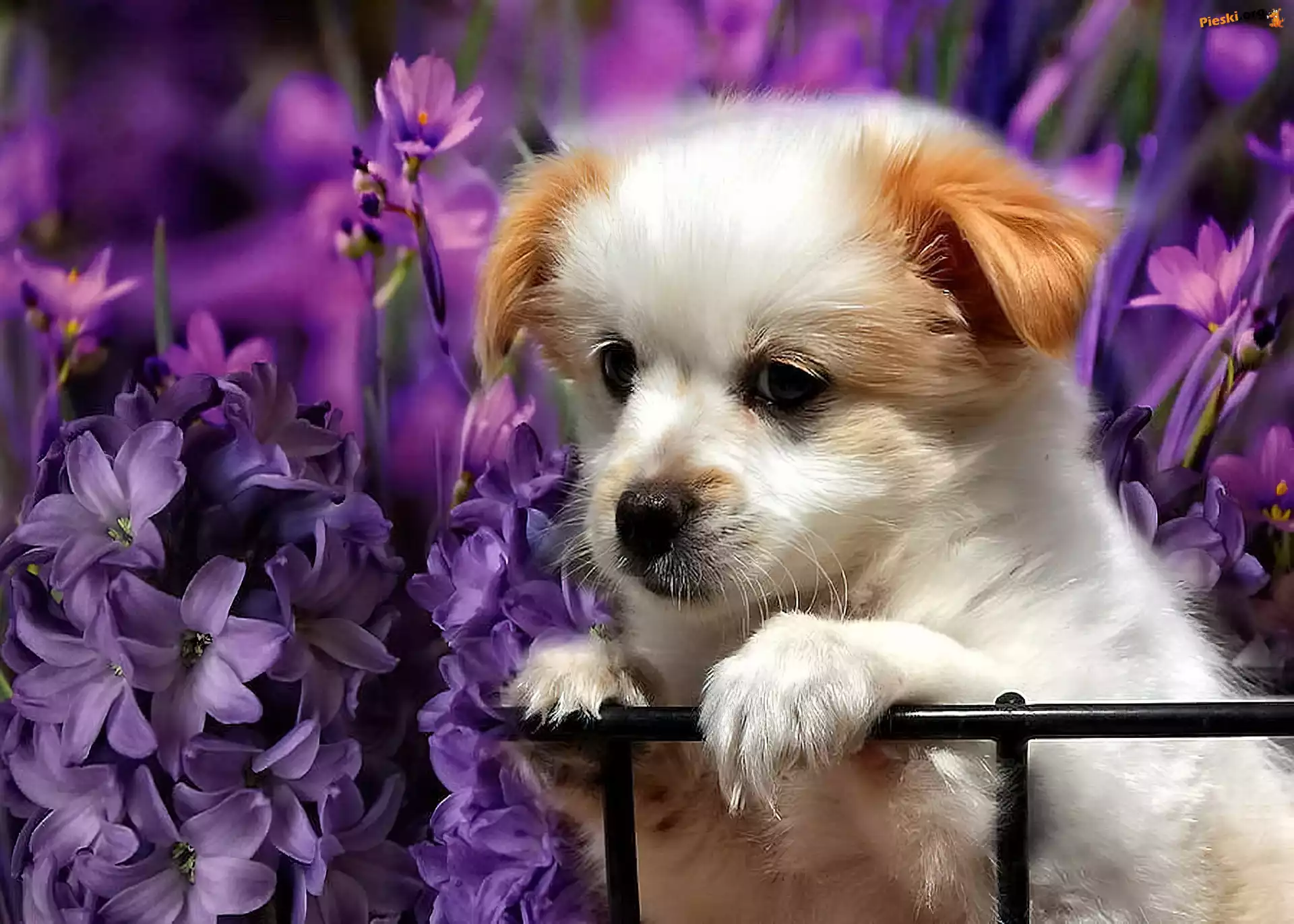 Fioletowe, Słodki, Szczeniaczek, Kwiaty, Pieski