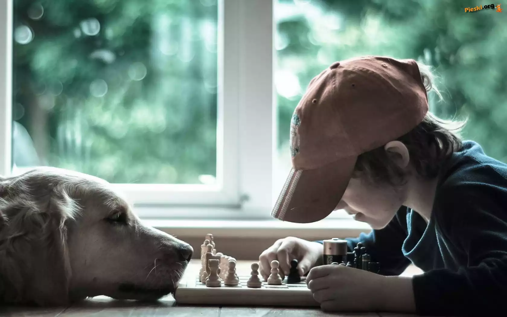 Golden Retriever, Chłopiec, Szachy, Pieski
