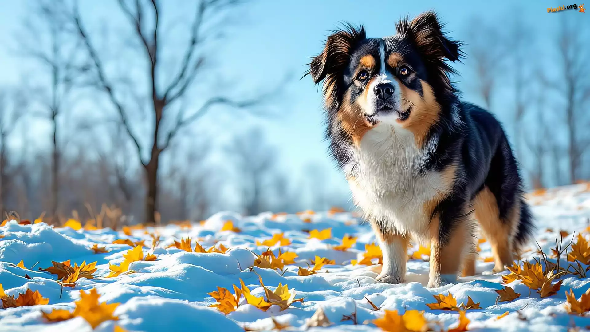 Liście, Zima, Pies, Grafika, Żółte, Śnieg