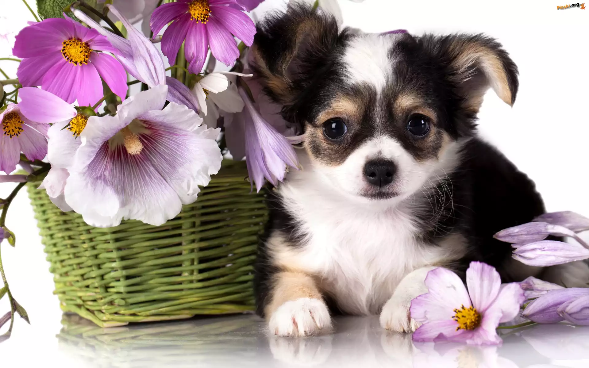 Kosz, Chihuahua, Szczeniak, Kwiatki, Pieski