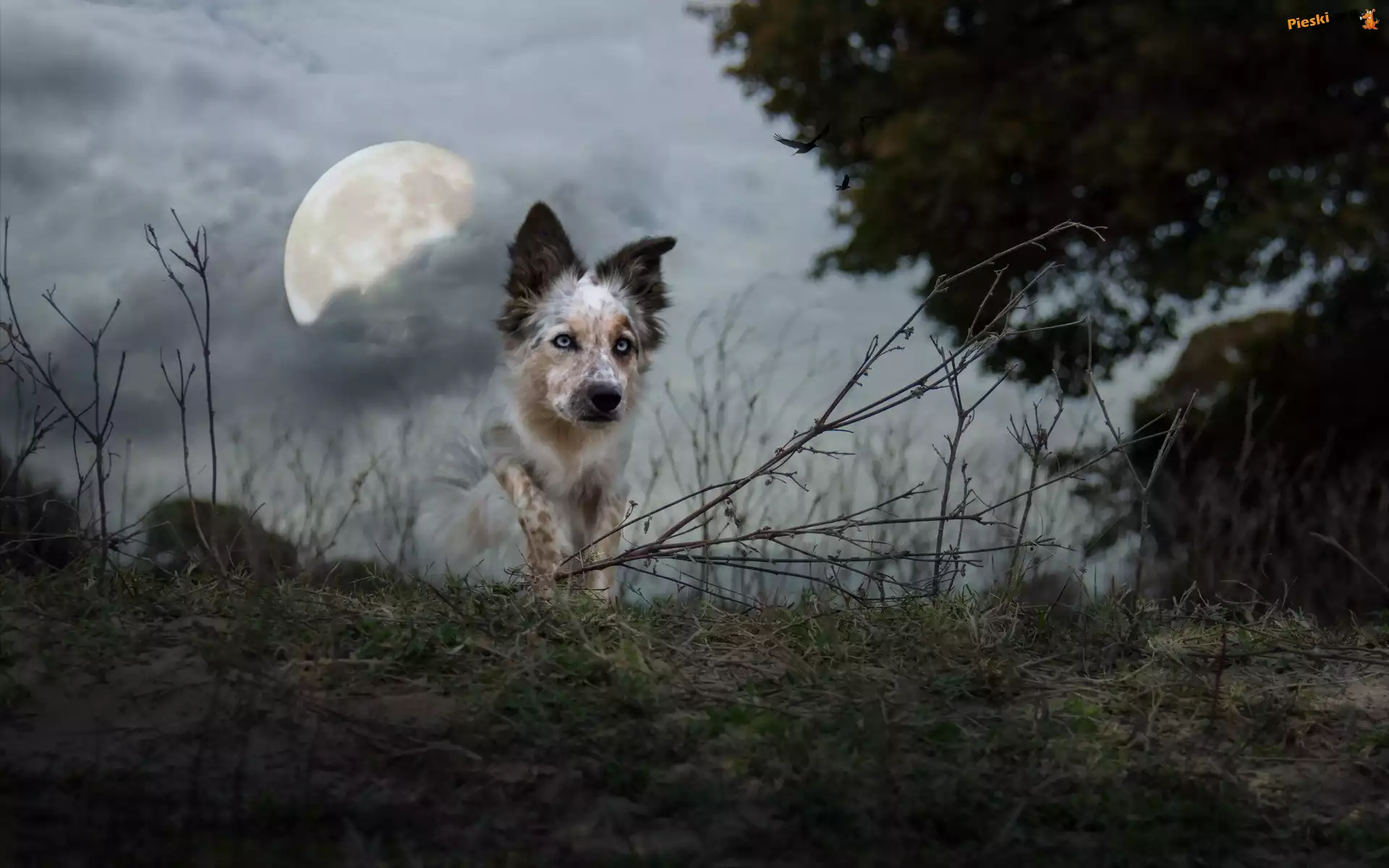 Księżyc, Collie, Border, Zmierzch, Ptaki
