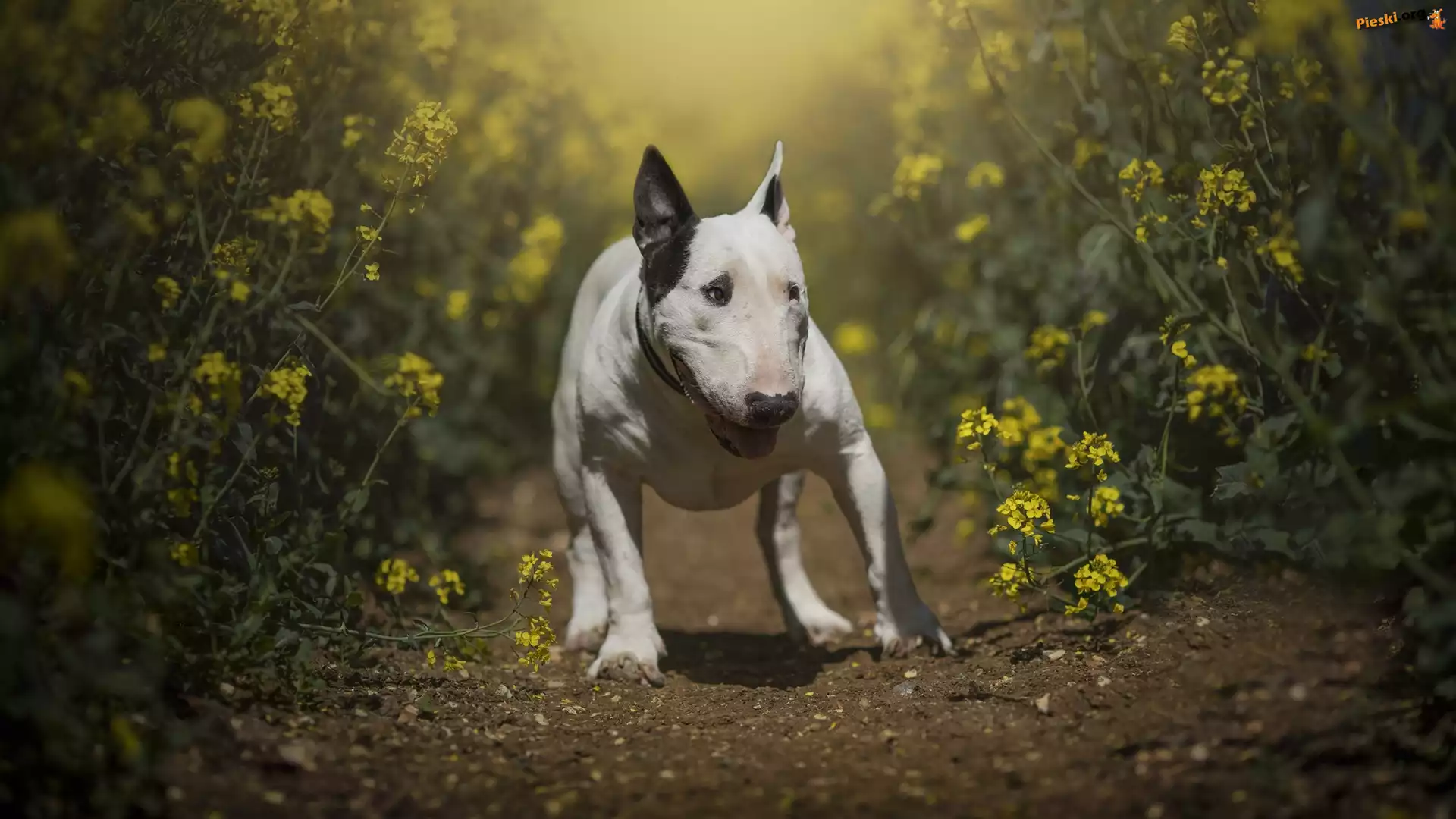 Kwiaty, Pies, Bulterier, Ścieżka
