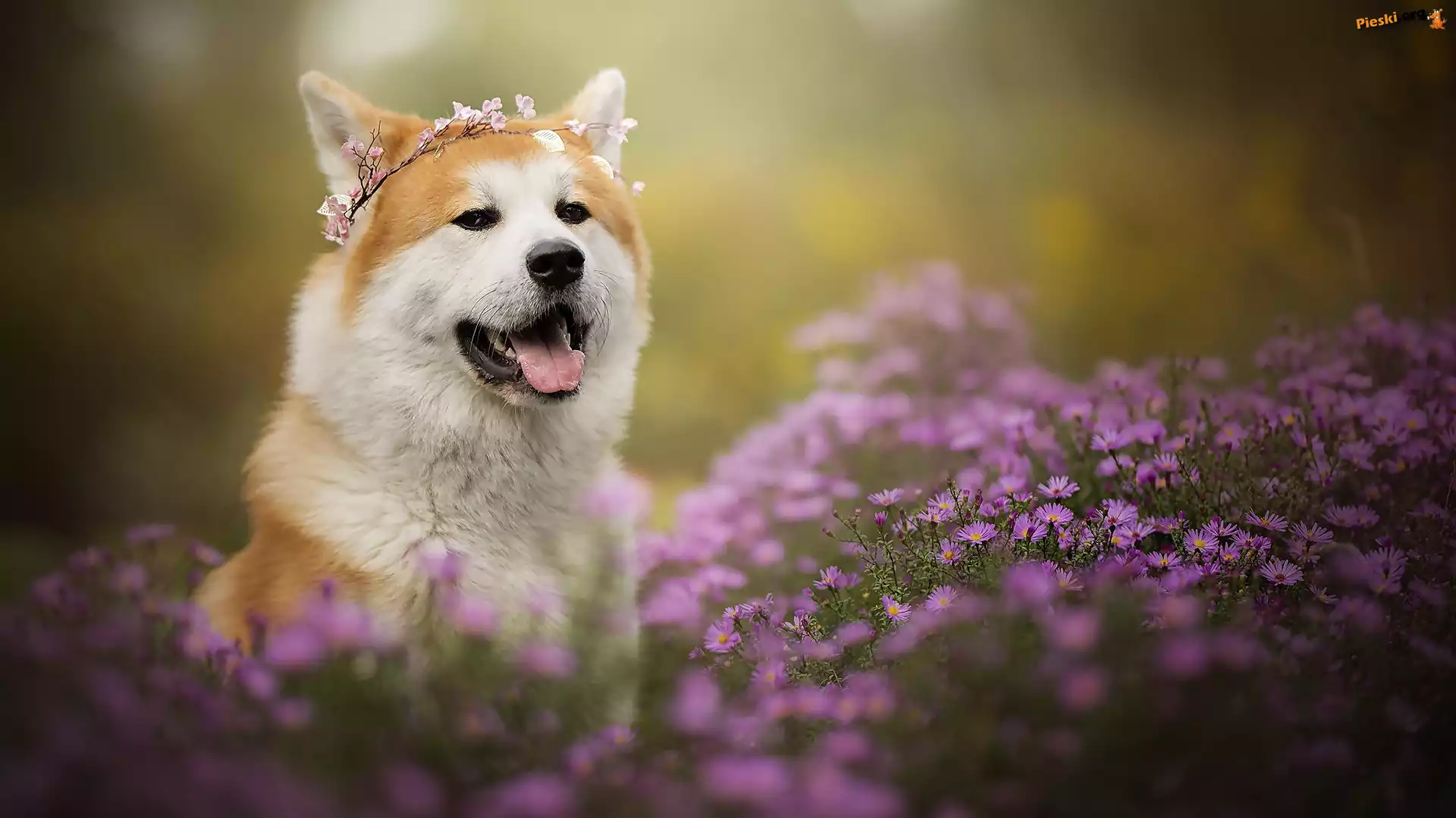 Pies, Kwiaty, Wianek, Akita inu, Mordka, Astry marcinki, Pieski