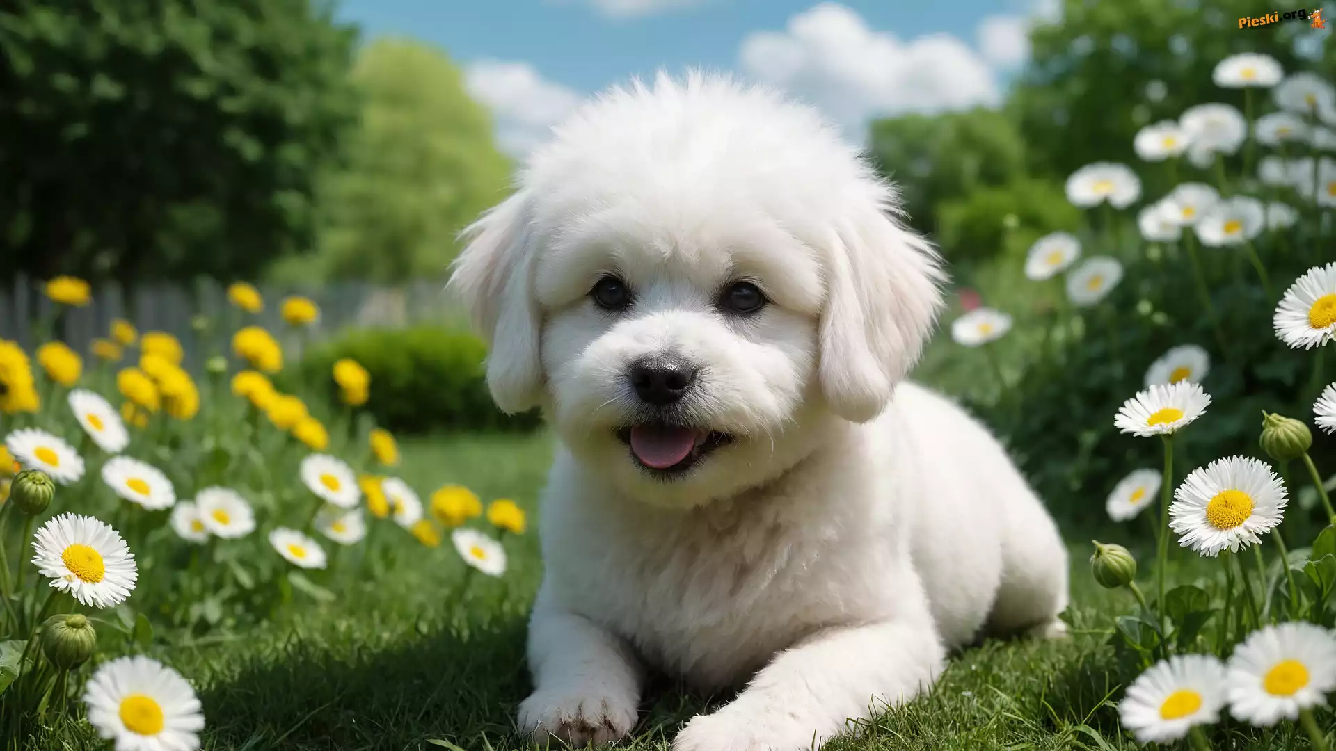 Biały, Łąka, Pies, Kwiaty, Szczeniak, Pieski