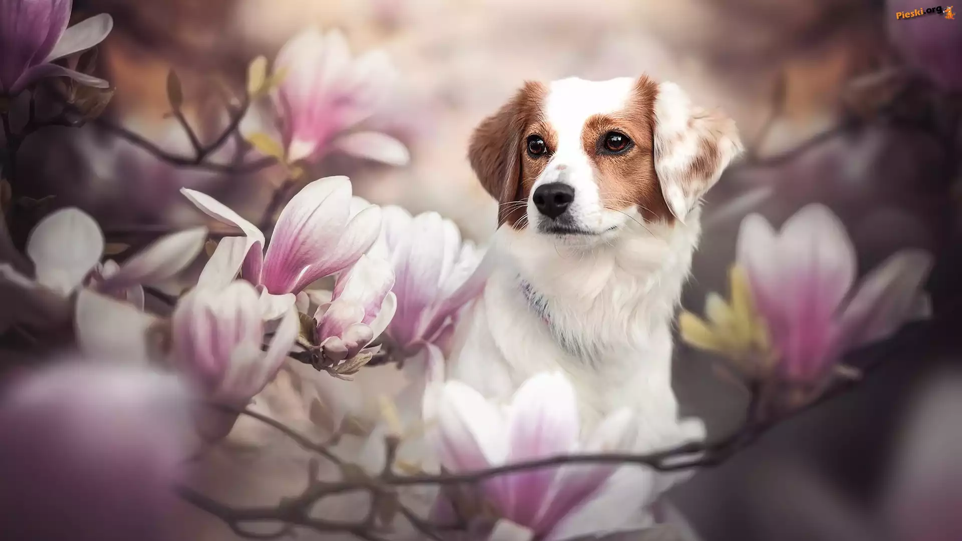 Spojrzenie, Magnolie, Pies, Kwiaty, Płochacz