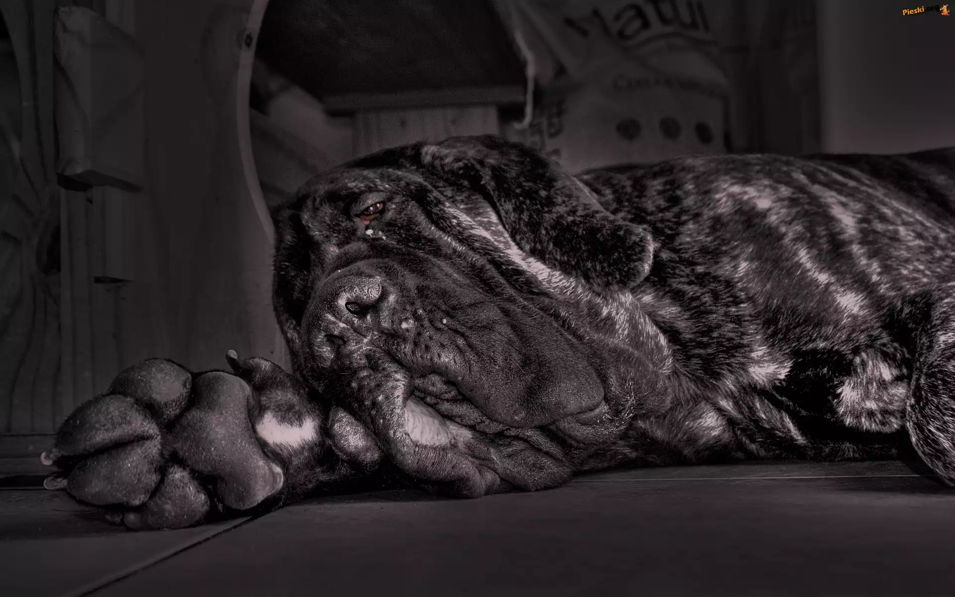 Mastif neapolitański, Pies, Szczeniak, Fotel Morda, Mastifa neapolitańskiego Pies, Mastif, Neapolitański Mastif, Odpoczynek Mastif neapolitański, czerwona, obroża Mastif neapolitański, szare, umaszczenie