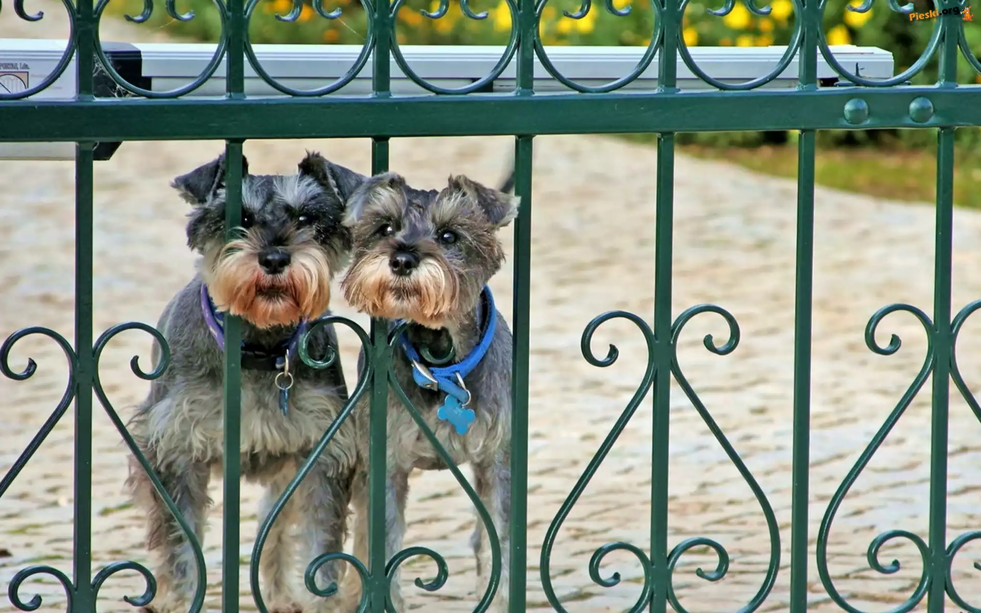 Miniaturka, Psy, Dwa, Sznaucery, Ogrodzenie