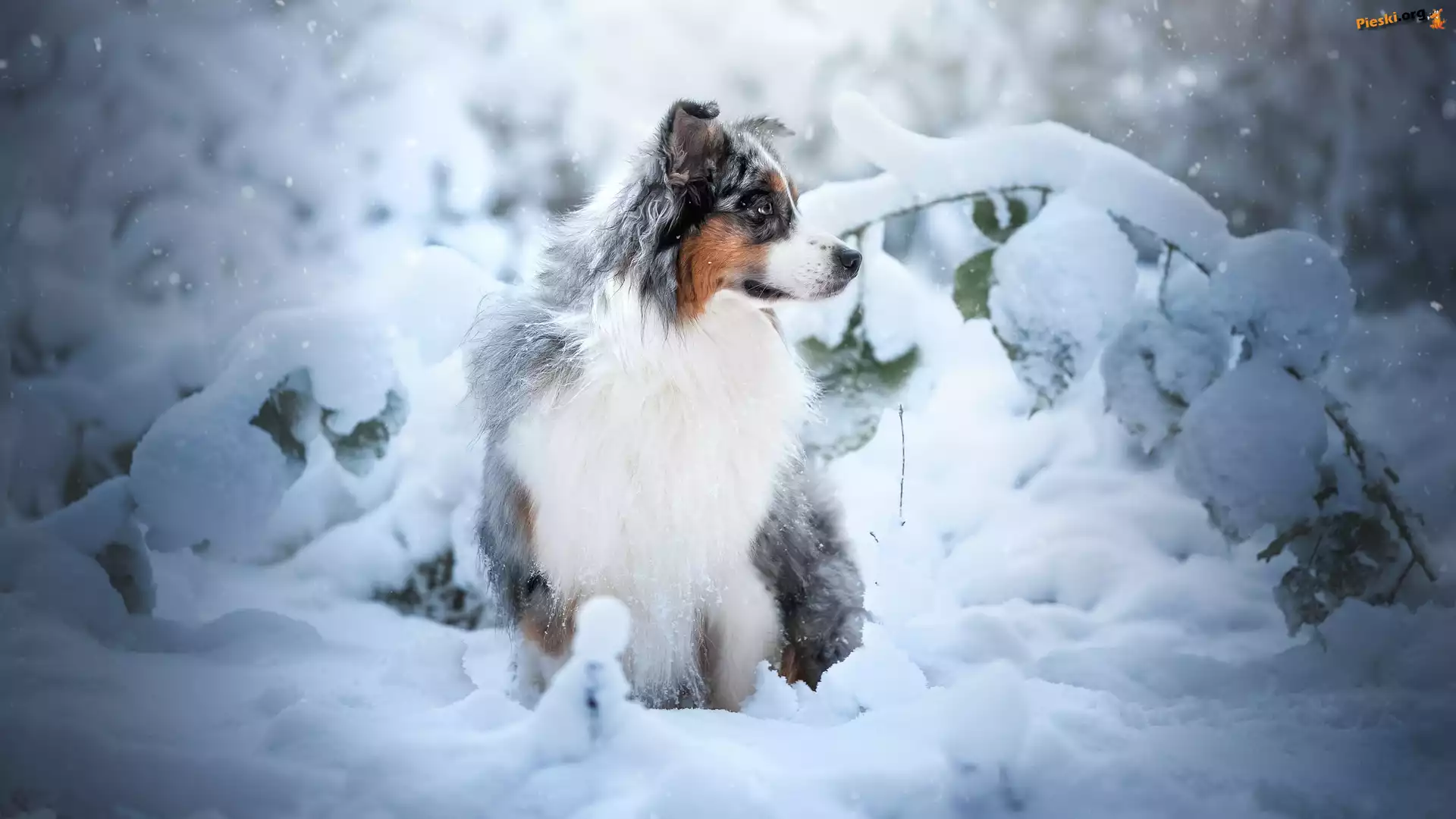 Śnieg, Owczarek australijski, Pies, Rośliny, Zima, Pieski