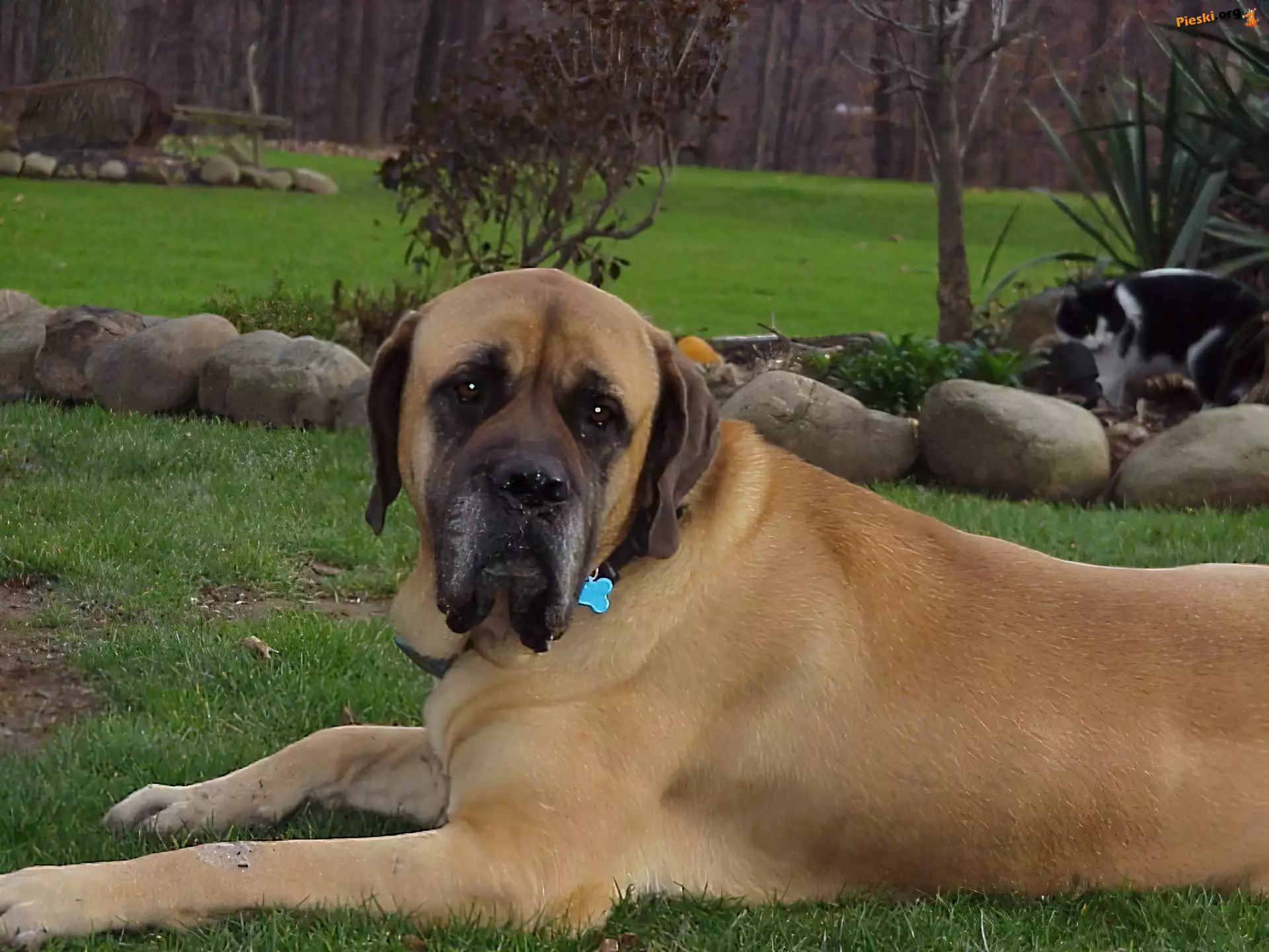 ogród, Mastif angielski, Mastiff, kot, Pieski