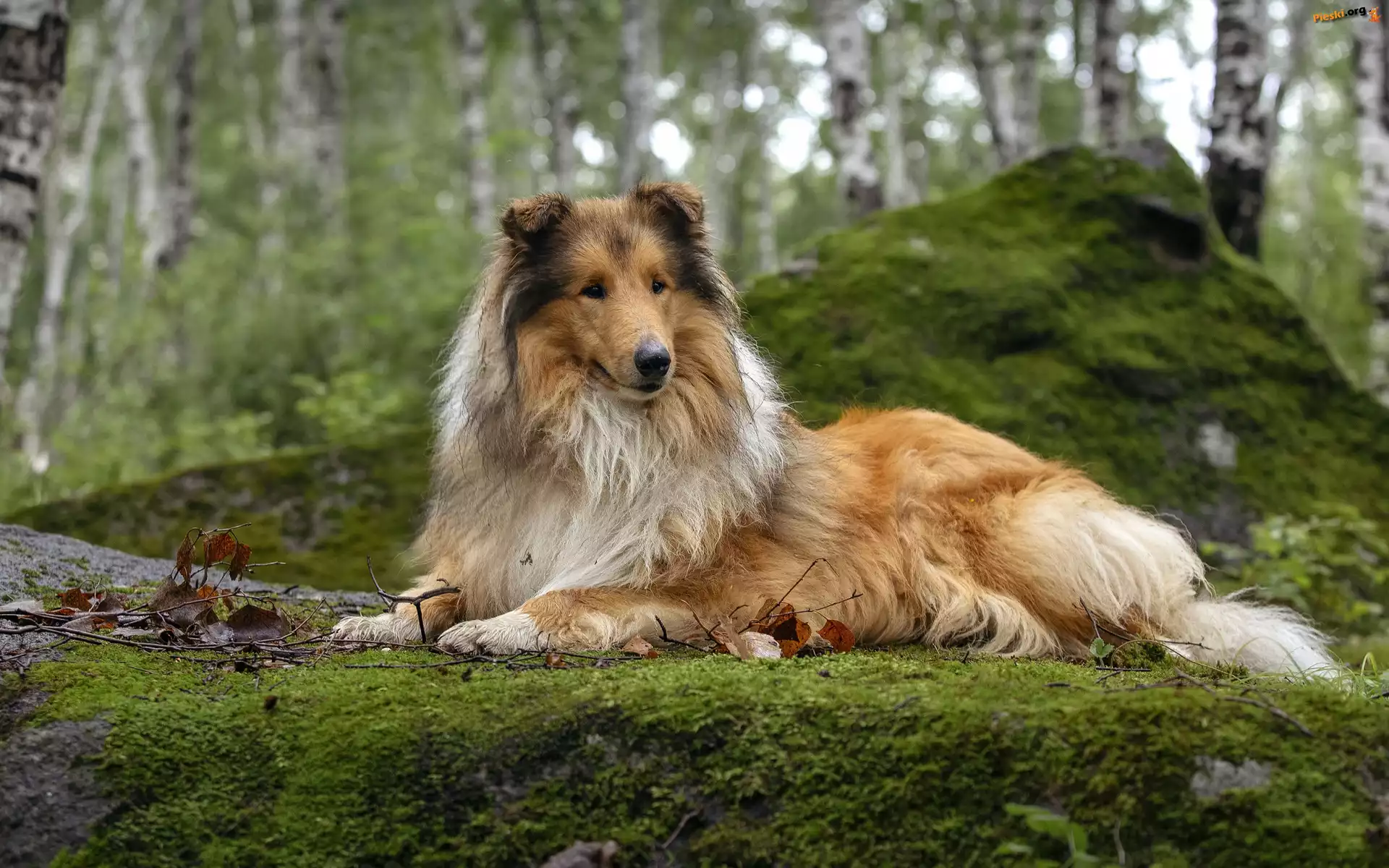Las, Pies, Skała, Drzewa, Omszała, Owczarek szkocki długowłosy, Pieski