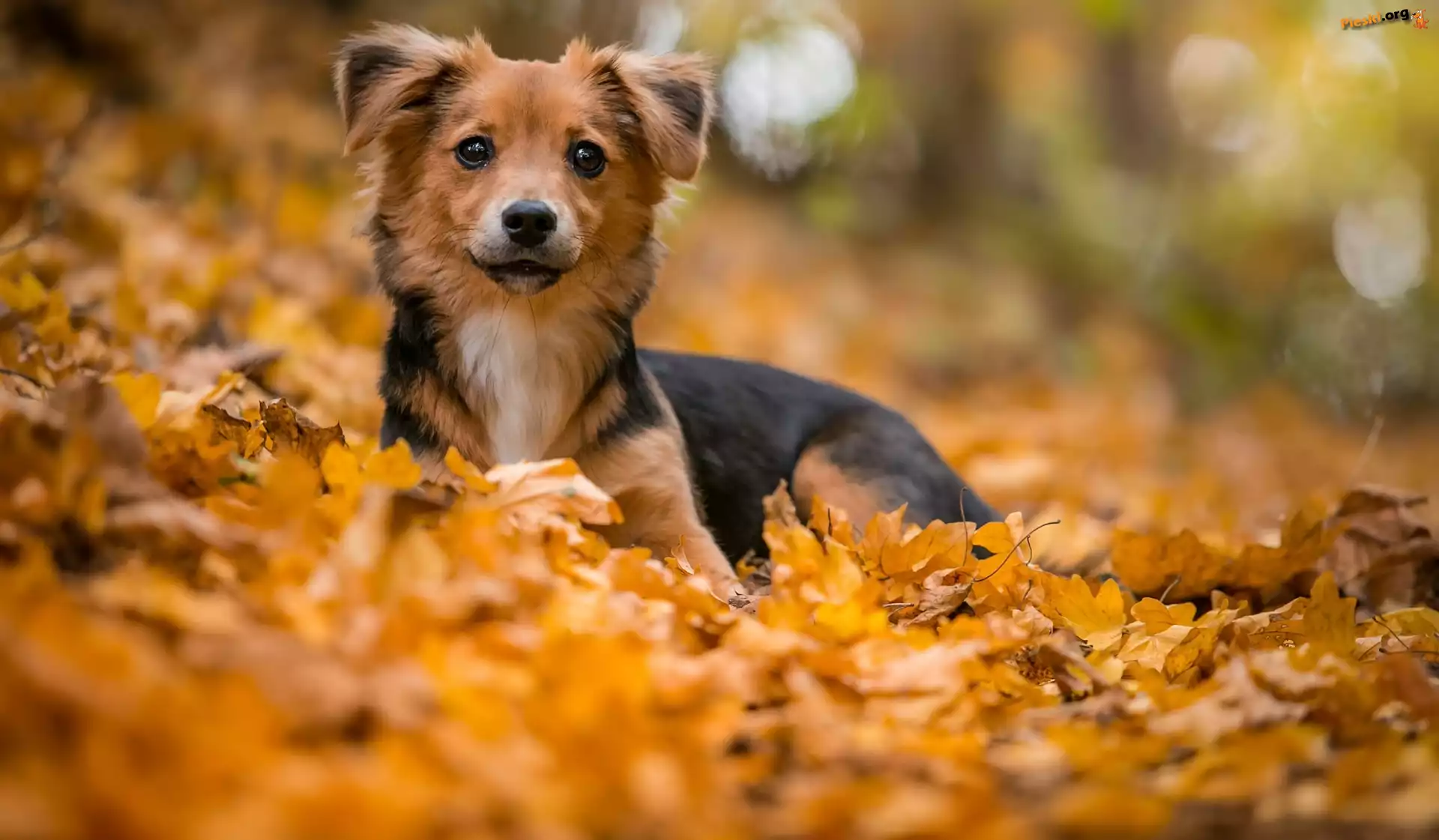 Leżący, Pies, Liście, Pieski