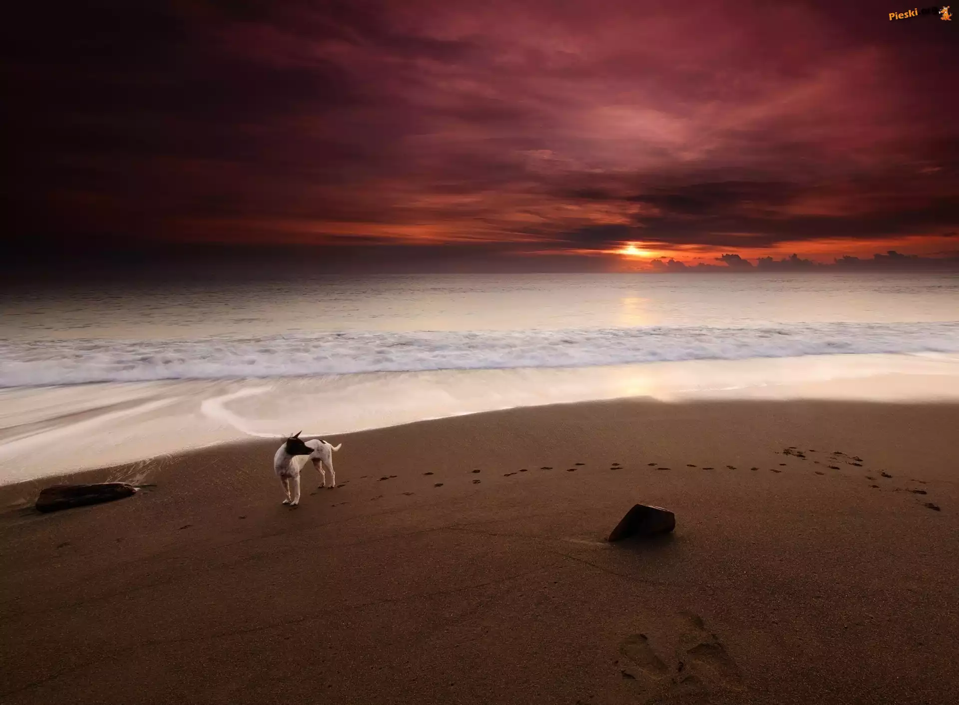 Morze, Piesek, Zachód Słońca, Plaża, Piasek, Ślady, Pieski