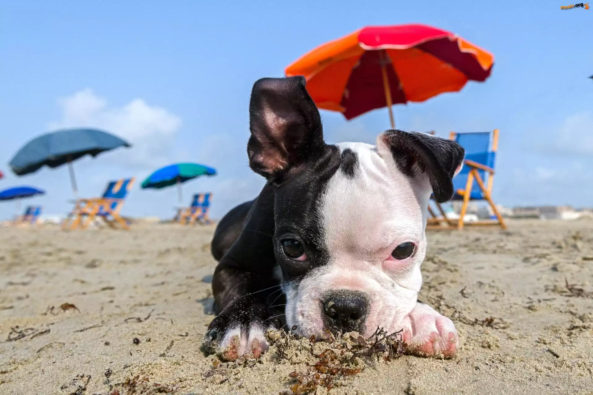 Parasole, Szczeniaczek, Plaża, Mops