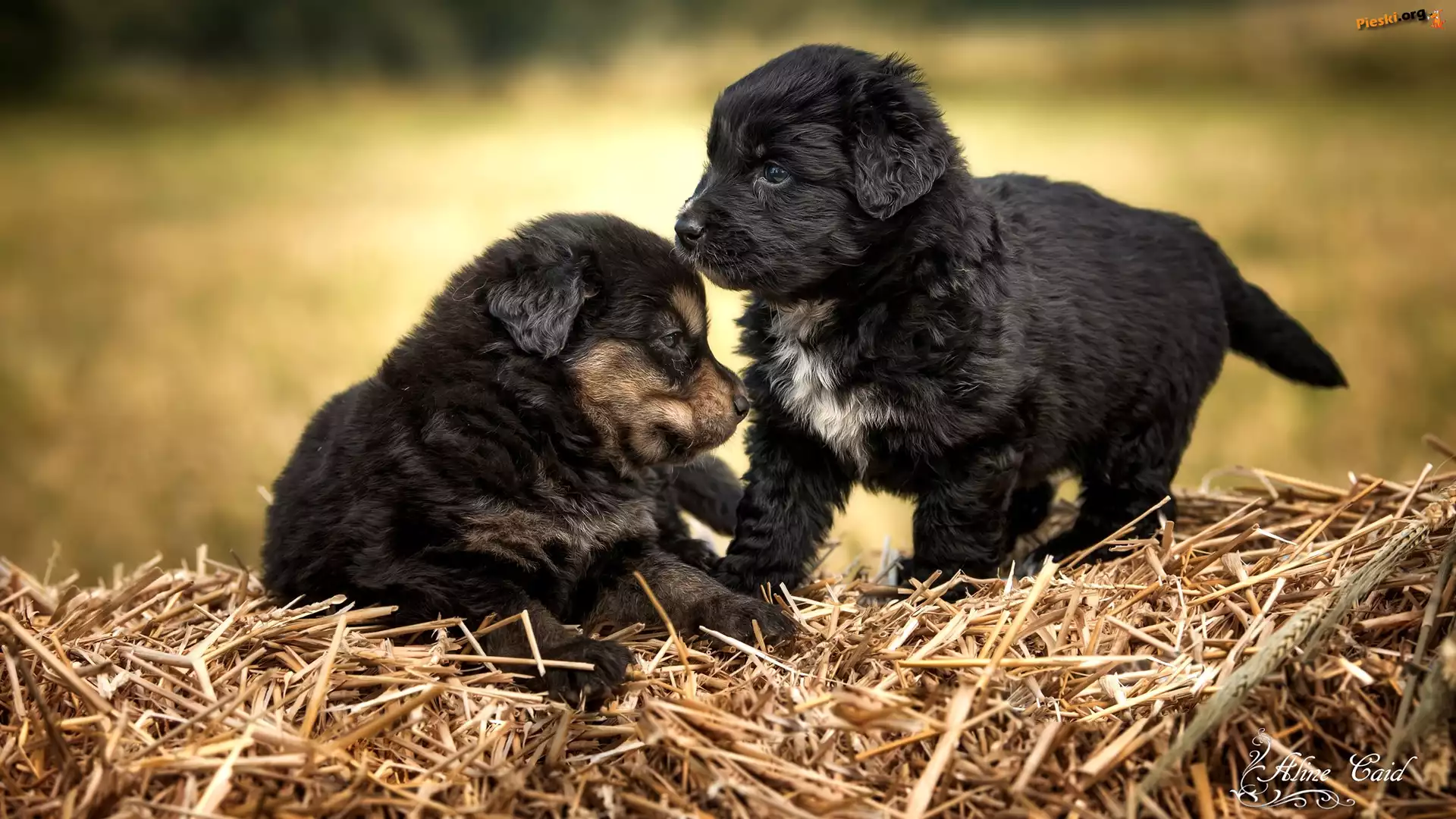 Szczeniaki, Psy, Dwa, Czarne, Słoma, Pieski