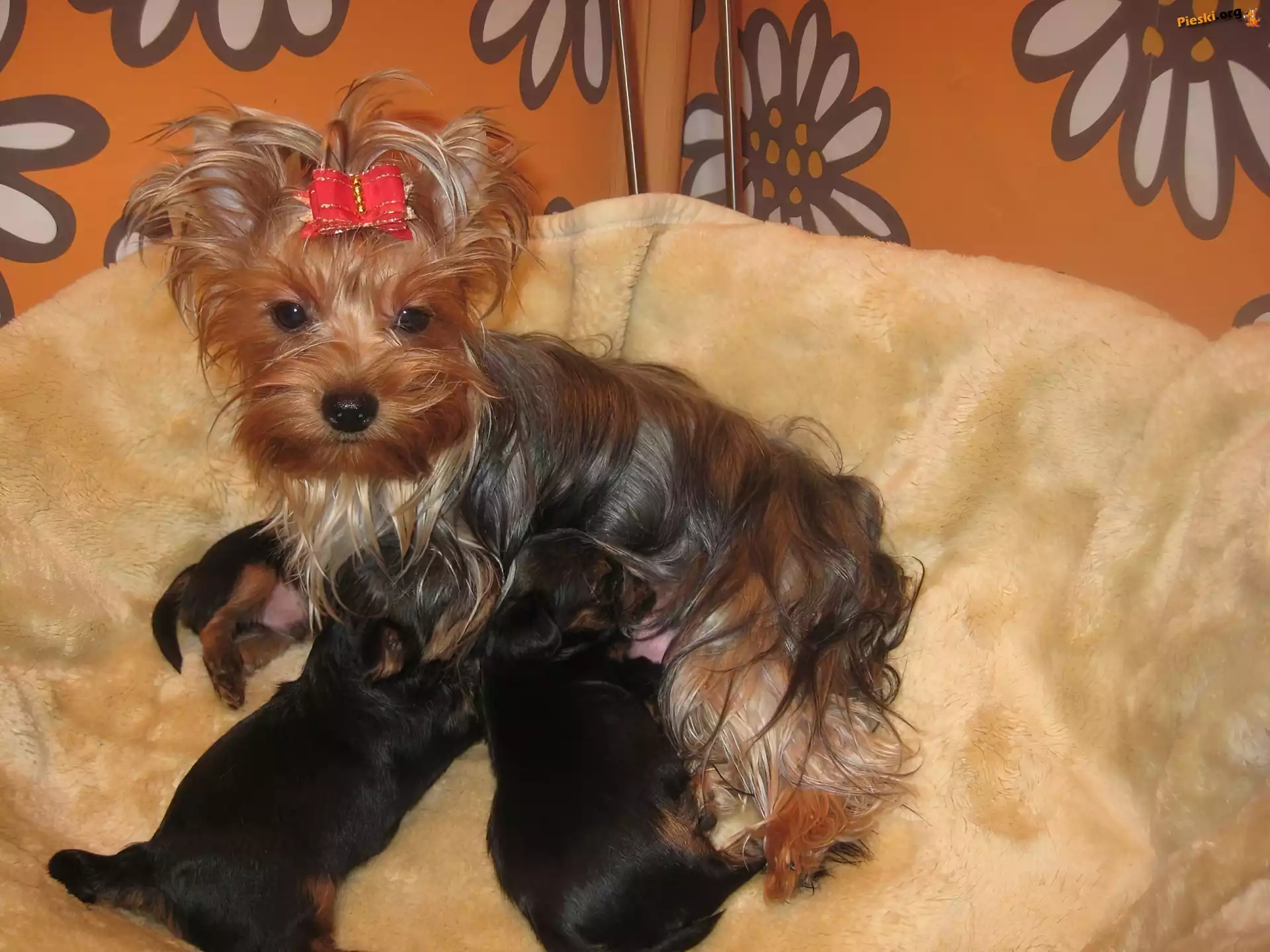 szczeniaki, suka, karmiąca, trzy, Yorkshire Terrier