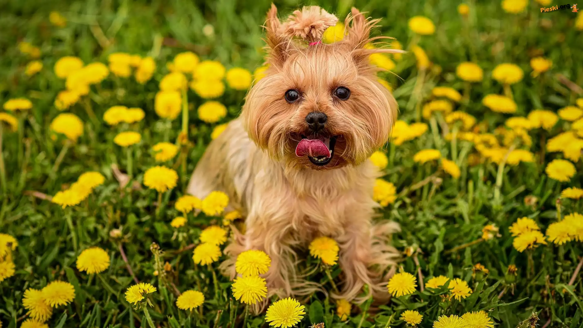 Pies, Trawa, Mlecze, Yorkshire terrier, Kwiaty, Łąka