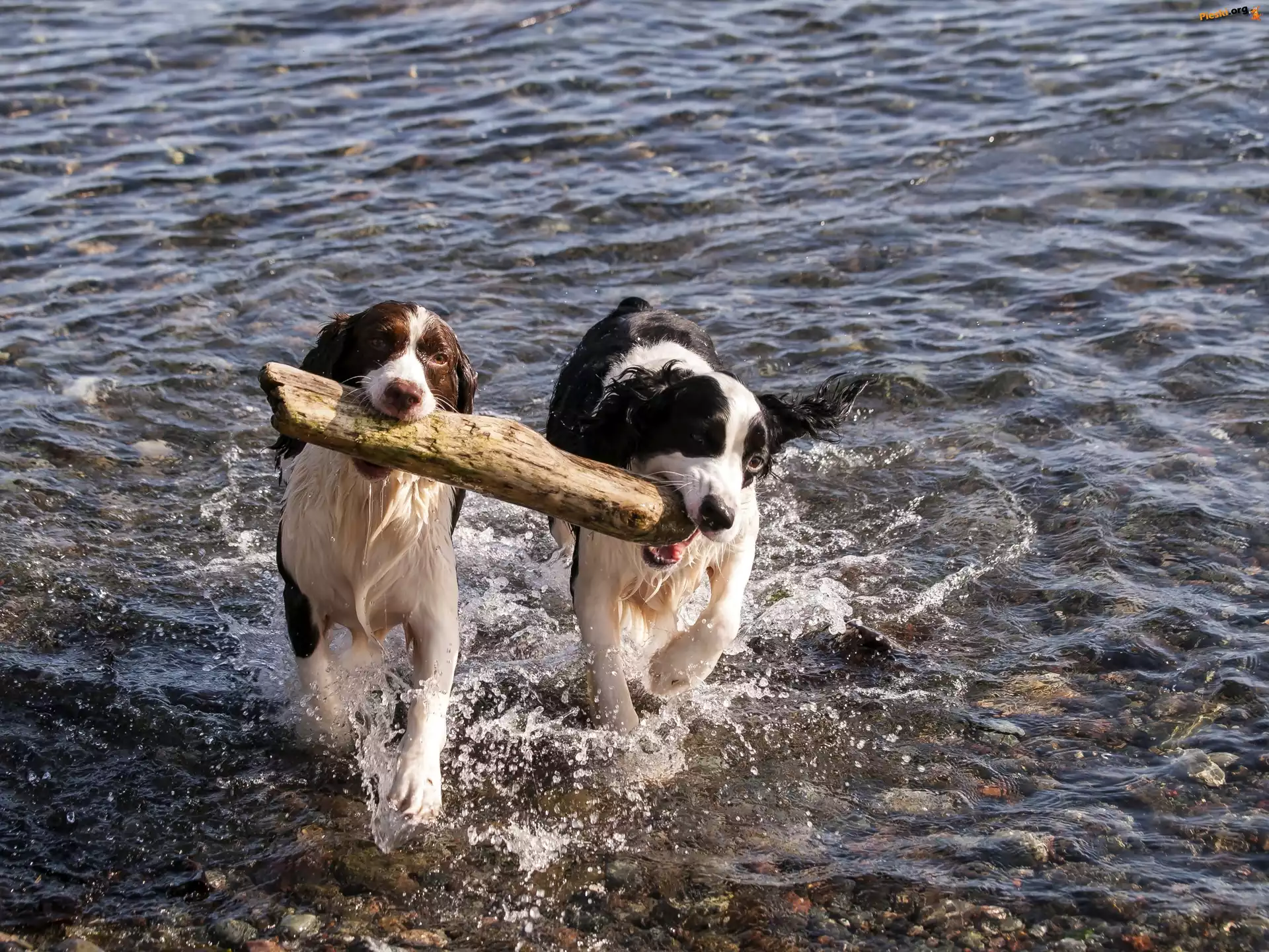 Zabawa, Szczeniaki, Border Collie, Drewno, Rzeka, Pieski