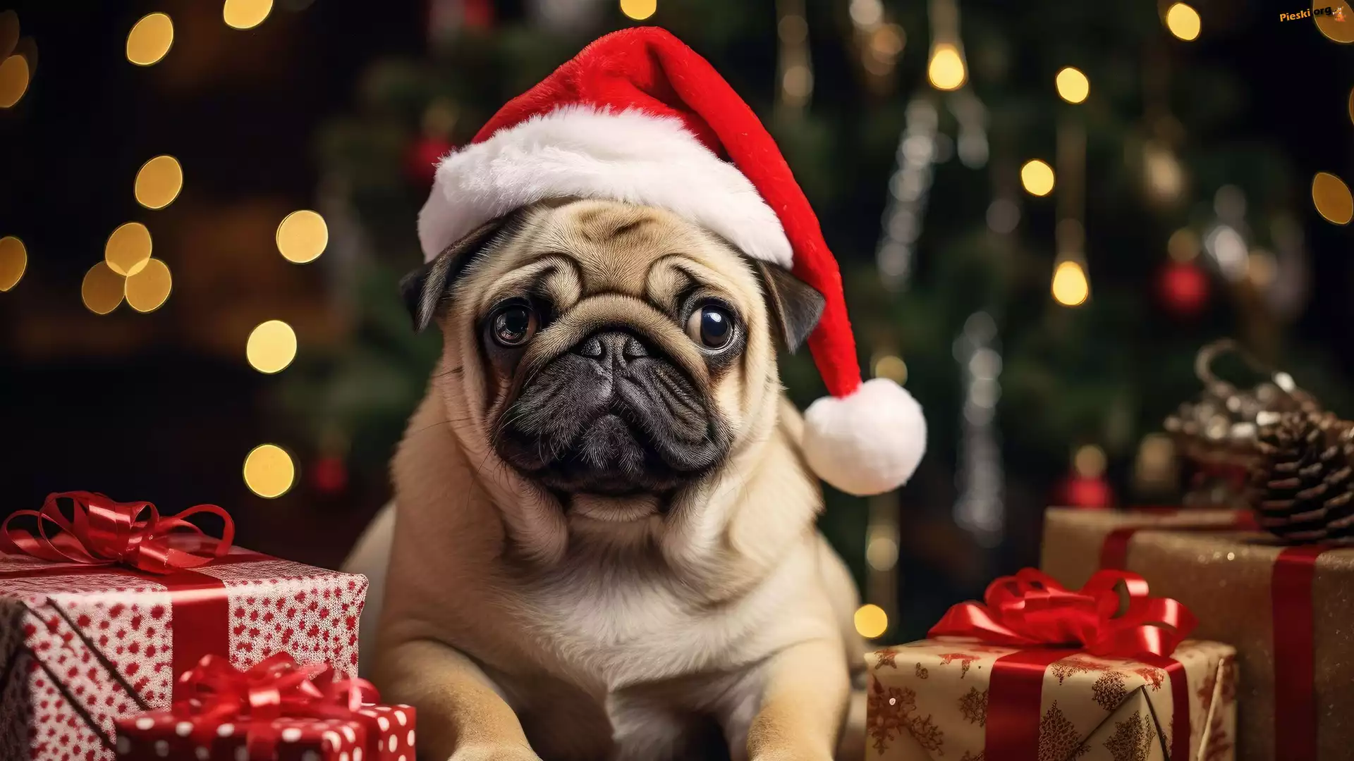 Prezenty, Pies, Mops, Zabawny, Święty Mikołaj, Pieski