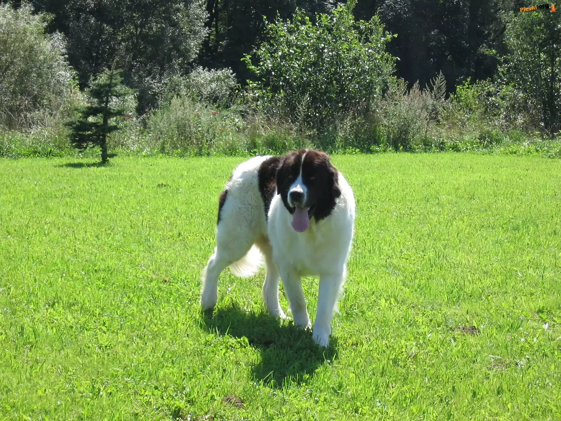 pysk, Landseera trawa, zielona, Landseer morda, Landseera mordka, Landseera Morda, Landseera trzy, Landseery biegnący, Landseer Piesek, Łąka słodkie, szczeniaki, Landseery kratka, chustki, Landseer biało-czarny, Landseer Kot, Pies, Słodkie